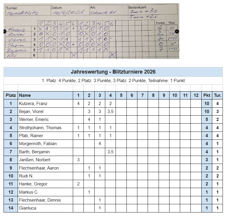 10.04.2026 – Ergebnisse des Monatsblitzturniers im April