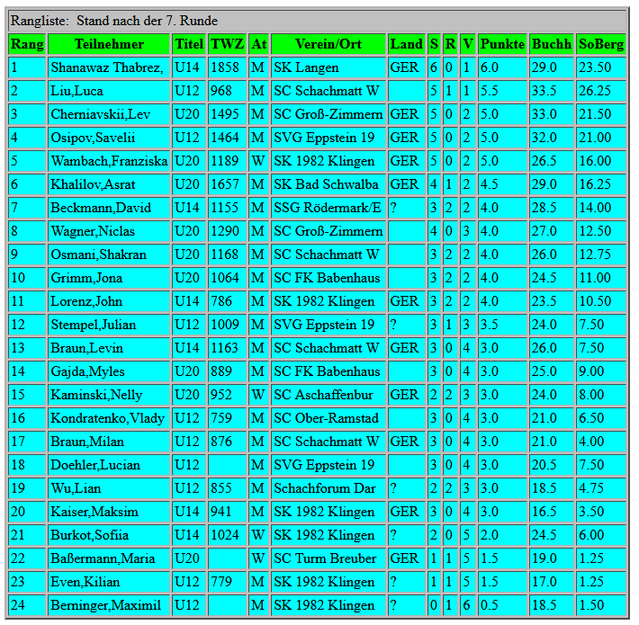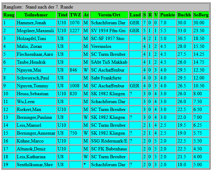 Auch der gastgebende Schachclub Turm Breuberg war mit fünf Nachwuchsspielern vertreten. In der U8 traten Katharina Leis und Aaron Flechsenhaar an, in der U10 Manuel Leis und Max Riekert, sowie in der U20 Maria Baßermann. Alle Breuberger Teilnehmer sammelten wertvolle Turniererfahrung und belegten einige vordere Plätze in der Endwertung.